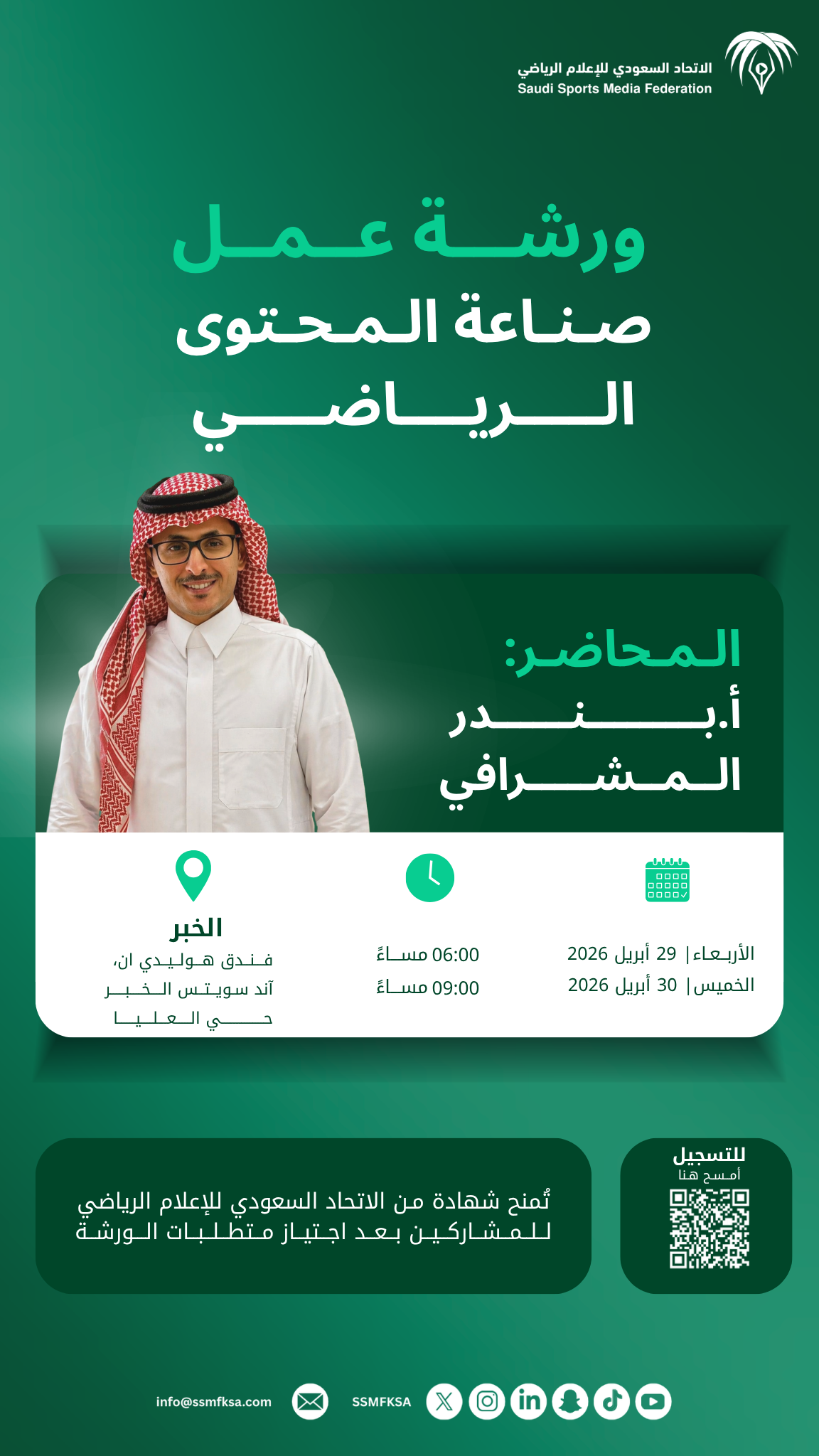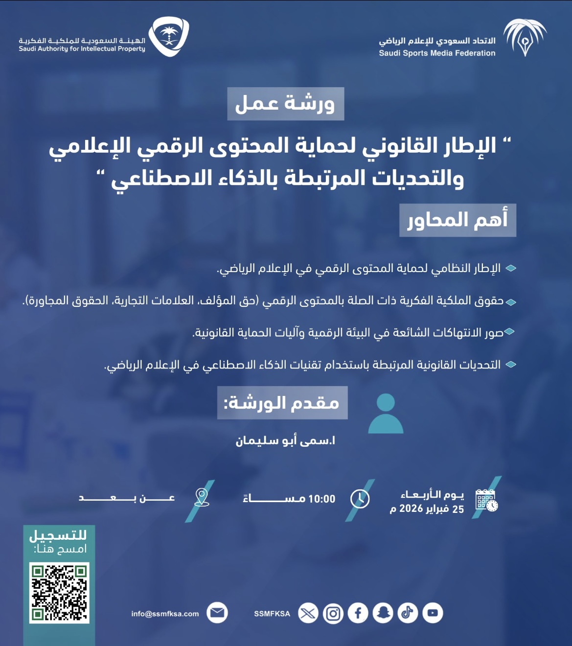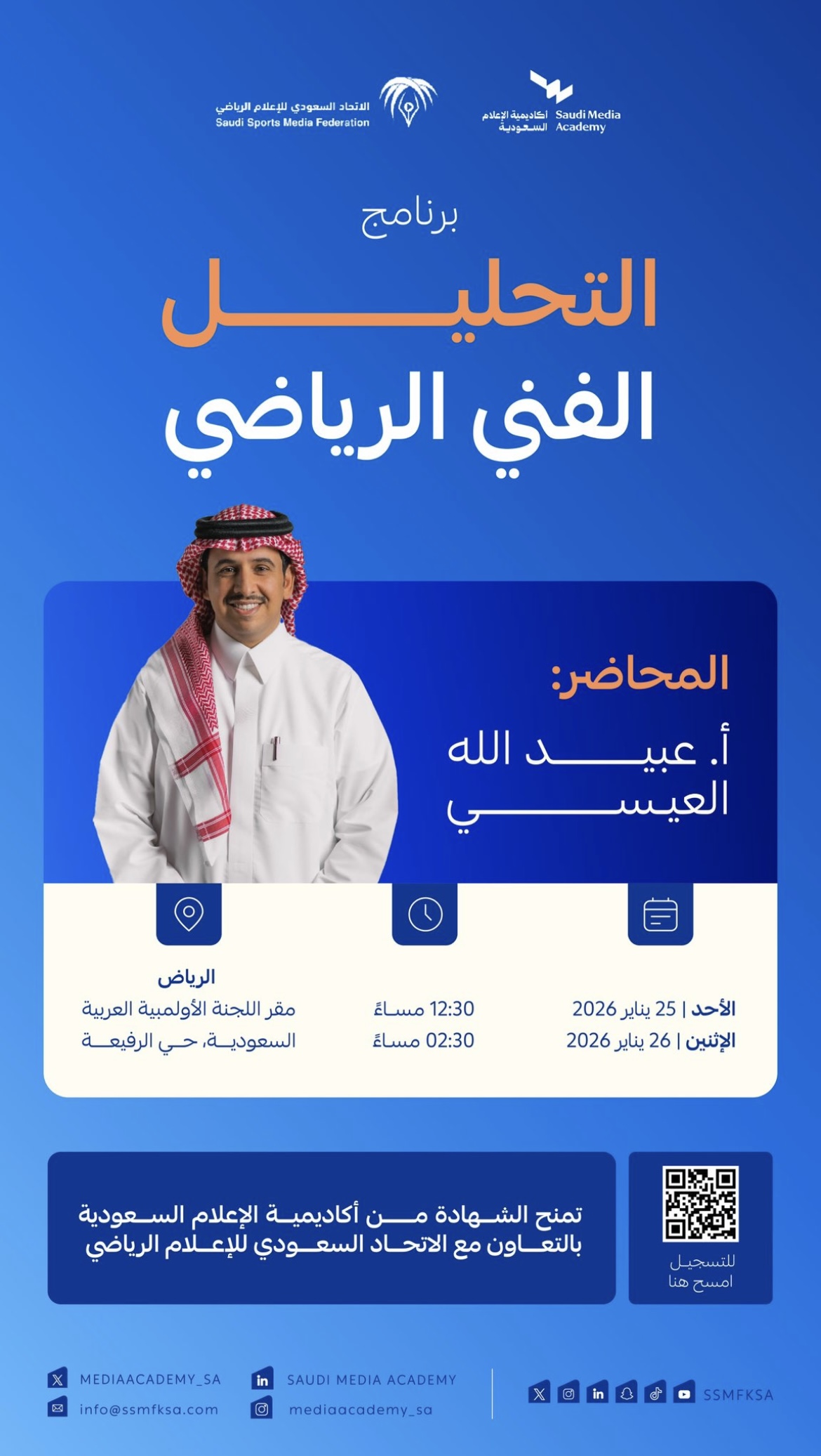 أقام الاتحاد السعودي للإعلام الرياضي، بالتعاون مع أكاديمية الإعلام السعودية، برنامج «التحليل الفني الرياضي»، وذلك يومي الأحد والاثنين 25 و26 يناير 2026م، في مقر اللجنة الأولمبية والبارالمبية السعودية بمدينة الرياض.…
