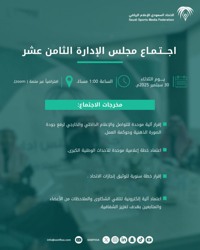 عقد مجلس إدارة الاتحاد_السعودي_للإعلام_الرياضي اليوم اجتماعه الثامن عشر “افتراضياً”، برئاسة رئيس المجلس وبحضور الأعضاء، حيث جرى خلاله اعتماد عدد من الخطط والبرامج التطويرية، ومناقشة آليات تعزيز جودة العمل الإعلامي، بما…