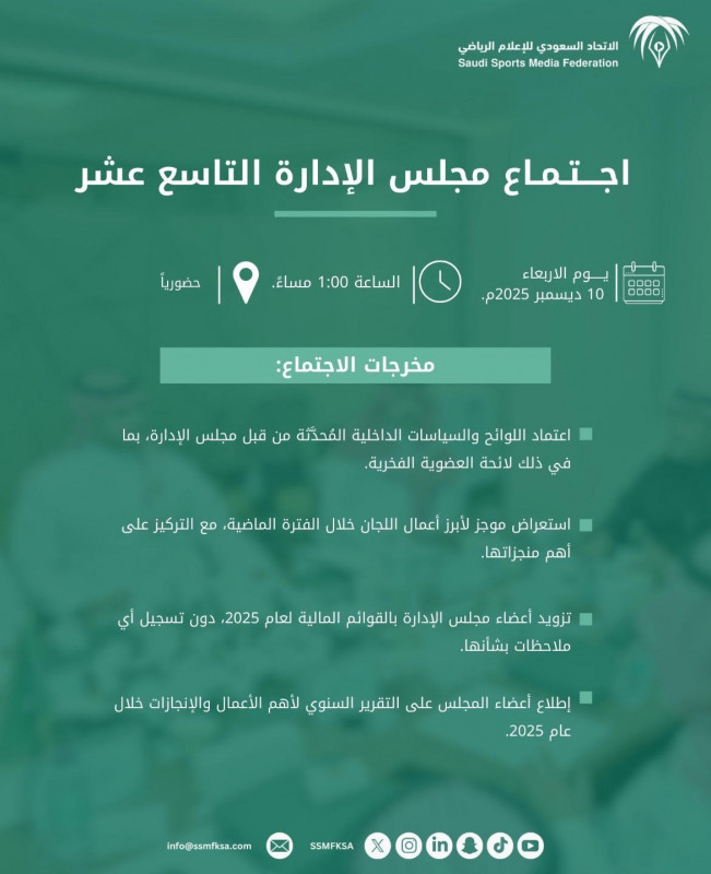 سيعقد مجلس إدارة الاتحاد السعودي للإعلام الرياضي اجتماعه التاسع عشر في 10 ديسمبر 2025م، في إطار استمرارية العمل على تطوير المبادرات والبرامج الداعمة لمنظومة الإعلام الرياضي، والارتقاء بالخدمات المقدمة للأعضاء…