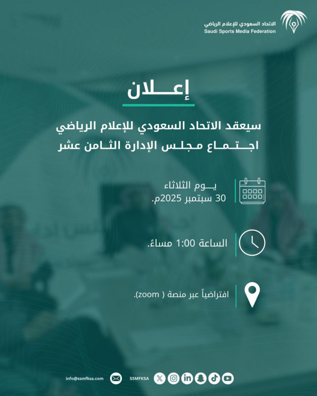 في 30 سبتمبر 2025م ،سيعقد الاتحاد السعودي للإعلام الرياضي اجتماعه الثامن عشر لمجلس الإدارة، لمواصلة مسيرة التطوير نحو إعلام رياضي أكثر تأثيرًا ، وشراكات استراتيجية أوسع ، وخدمات متقدمة ترتقي…