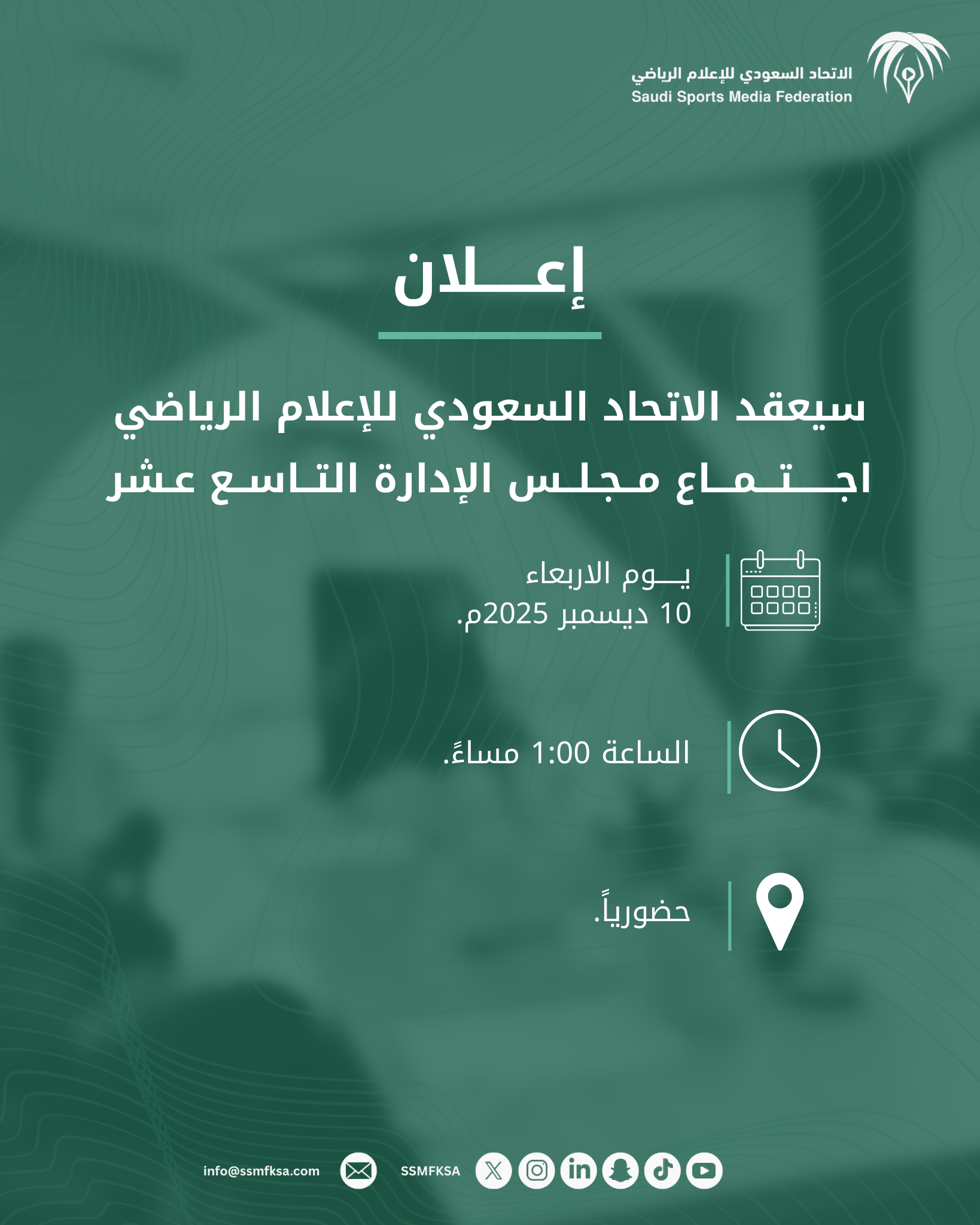 سيعقد مجلس إدارة الاتحاد السعودي للإعلام الرياضي اجتماعه التاسع عشر في 10 ديسمبر 2025م، في إطار استمرارية العمل على تطوير المبادرات والبرامج الداعمة لمنظومة الإعلام الرياضي، والارتقاء بالخدمات المقدمة للأعضاء على مستوى المملكة .
